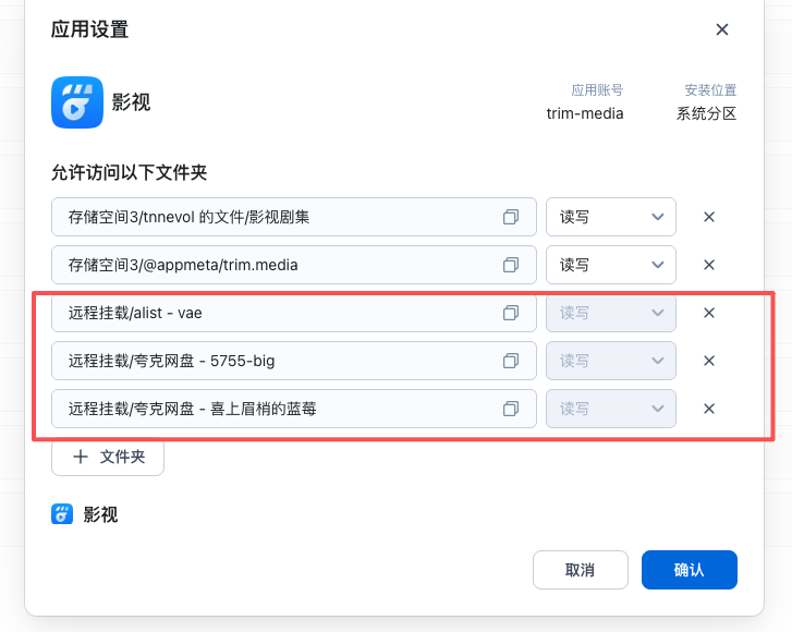将挂载好的网盘以及openlist都可以授权给飞牛影视
