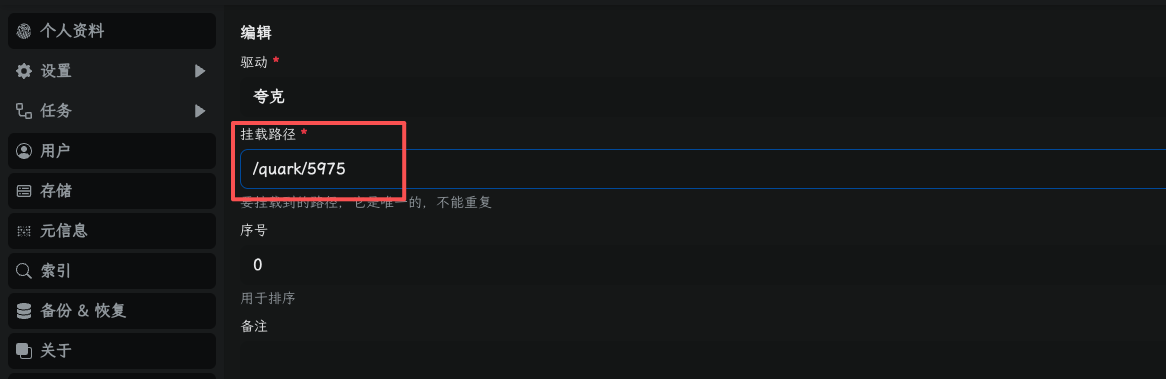 其他配置保持默认,挂载路径需要记住,我的是 /quark/5975